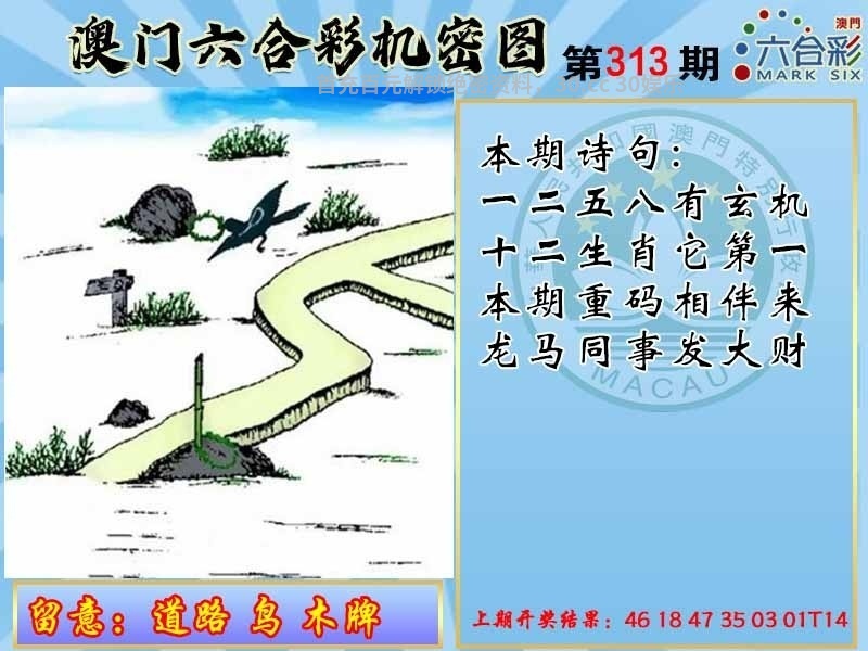 【精解澳门机密图】开(龙38) 313期诗句:一二五八有玄机,十二生肖它第一,本期重码相伴来,龙马同事发大财 313期留意:道路鸟木牌 【综合取特】羊狗猴兔鸡龙 |